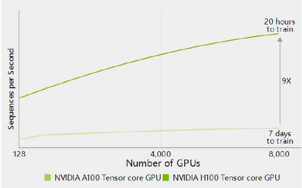 图表3:在多专家模型(3950亿个参数)训练过程中H100与A100性能对比