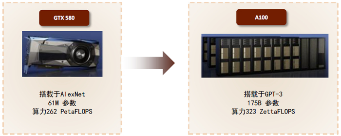 AI训练:英伟达优势领域,算力持续提升赋能生成式大模型突破。基于GPU并行计算的特性以及英伟达在AI领域的前瞻布局,英伟达在AI训练领域拥有较为优势的行业地位,并持续提升其计算能力。回顾过去,英伟达于2010年发布的GTX 580产品为经典卷积网络模型AlexNet提供算力支持,算力约262 PetaFLOPS;至2020年,训练GPT-3时使用的A100算力芯片,已经可以支持175B的参数处理,算力达323 ZettaFLOPS。