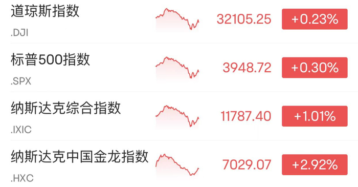 当地时间23日,美股三大股指集体收涨,截至收盘,道指涨0.23%,标普500指数涨0.30%,纳指涨1.01%。