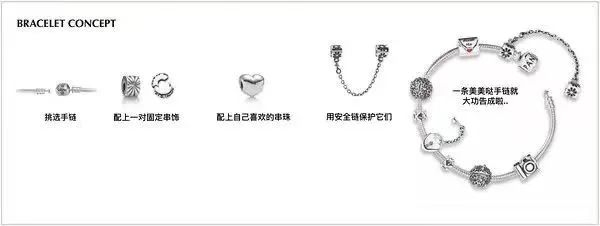 与众多珠宝品牌售卖定型产品不同,潘多拉并没有完整的成品手链,而是为消费者提供可选择的吊坠和手链,由消费者做主,任意组合个性化手链。