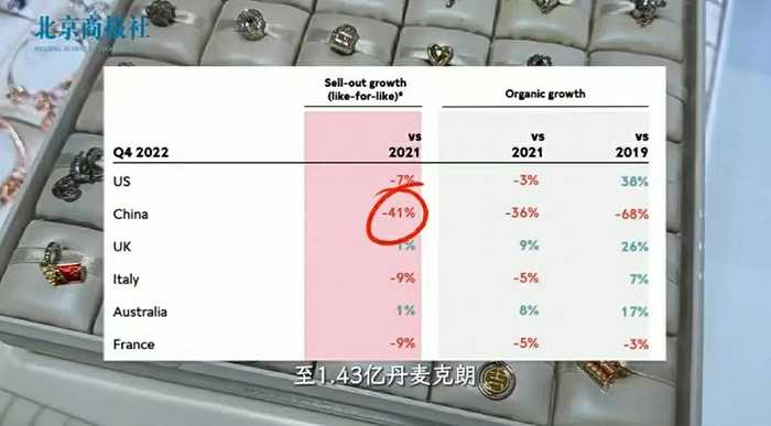 不但如此,据其财报显示,2022年第四季度,潘多拉中国市场销售额同比大跌41%至1.43亿丹麦克朗,总收入中的占比进一步收窄至1%。而2022年全年数据更加触目惊心,中国市场的销售总额同比下降47%。