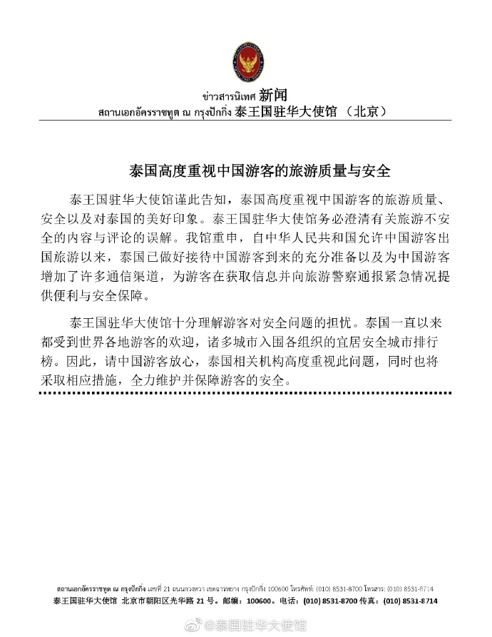 今天,泰王国驻华大使馆在声明中称,泰国已做好接待中国游客到来的充分准备,以及为中国游客增加了许多通信渠道。泰王国驻华大使馆十分理解游客对安全问题的担忧。