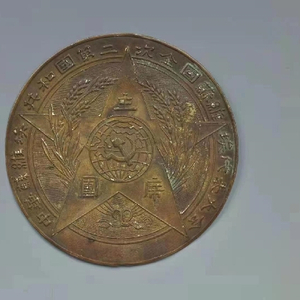 中华苏维埃共和国第二次全国苏维埃代表大会(以下简称“二苏大”),于1934年1月22日至2月1日,在瑞金沙洲坝临时中央政府大礼堂举行。在大会开幕式上,经江西代表蔡畅提议,选举了毛泽东、博古、项英等75人为主席团成员。大会为主席团成员事先准备的出席证,是一件铜制品。其形制为圆形薄片,直径7厘米,厚度不及1毫米。正面图案以五角星为主体,星内有地球,球上有镰刀斧头,星外环绕谷穗。“主席团”三字,分别刻在五角星的上角和右、左下角。外部与环衬五角星的双线圆圈之间,自左至右顺时针方向排列“中华苏维埃共和国第二次全国苏维埃代表大会”字样。全文均系隶书,除“会”字简化外,其余均为繁体字。整个图案设计突出了共产党领导下工农民主专政的主题,给人以明朗、稳重、庄严之感。值得强调的是,这种证章无背面设计制作(不妨说是正面图案的反刻版),可供佩戴。