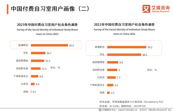 iiMedia Research(艾媒咨询)数据显示,2023年付费自习室用户多为社会普通职员,占比为42.5%。与2021年相比,普通职员的比重有所上升,学生的比重下降接近一半。艾媒咨询分析师认为,付费自习室用户不局限于学生,社会工作者已经成为主要用户群体,普通职员对于付费自习室的需求提高,可能是出于谋求更好的工作职位,高层管理者也有着自我提升的需求。
