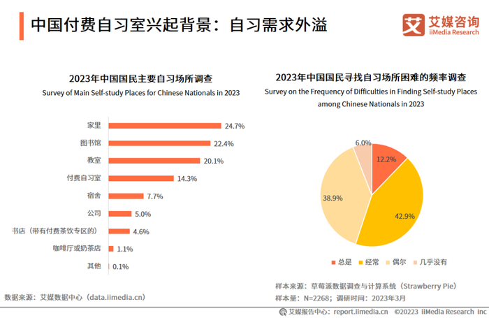 iiMedia Research(艾媒咨询)数据显示,教室和图书馆是国民最常去的自习场所,但公共设施资源有限,大部分自习需求无法得到满足,这就使得部分需求外溢到付费自习室等场所。艾媒咨询分析师认为,找自习空间难这个现象普遍存在,而相对于教室和图书馆等场所,付费自习室在门店密度和经营成本方面具有更高的灵活性和可控性,但付费自习室当前的渗透率较低,未来发展空间仍旧十分广阔。