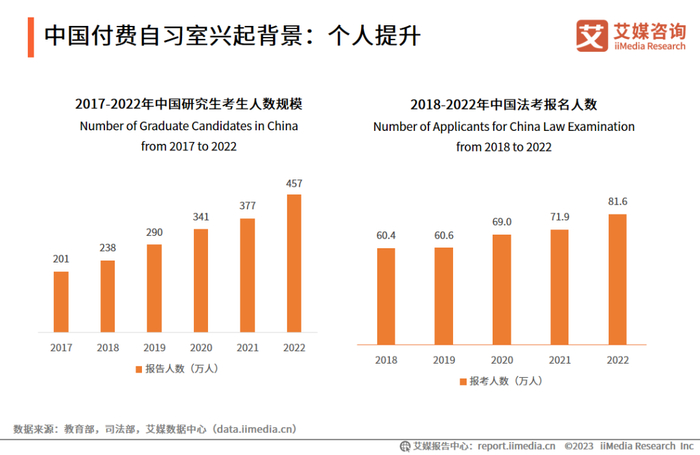 就业形势紧张及就业人数的增加,加剧了中国就业难度。为增加就业竞争优势,考研、考证等成为白领、大学生自我提升的重要途径。iiMedia Research(艾媒咨询)数据显示,中国研究生报考人数逐年攀升,2022年共有457万人报考研究生,有超过80万人报名法考。社会对自习室资源需求旺盛,刺激了付费自习室市场发展。