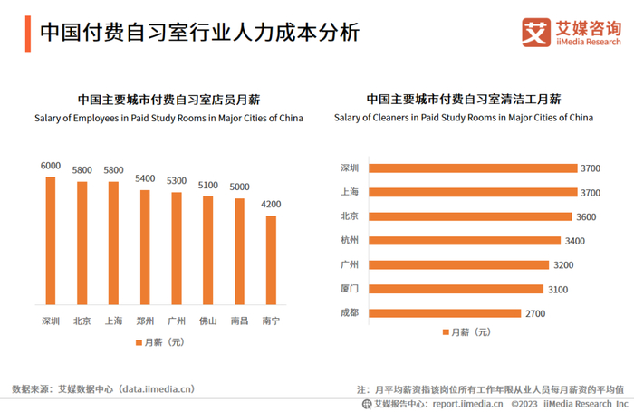 iiMedia Research(艾媒咨询)数据显示,一线城市上海、北京、深圳的人力成本较高,付费自习室店员月薪在5900元左右,清洁工月薪在3500元左右,其他城市的人力成本相对较低,付费自习室店员薪酬在5000元左右。艾媒咨询研究发现,按照每家店一名店员一名清洁工的配置计算,付费自习室在北京、上海、深圳的人力成本约为每年11.3万元左右,在其他城市的人力成本约为每年9.6万元左右。