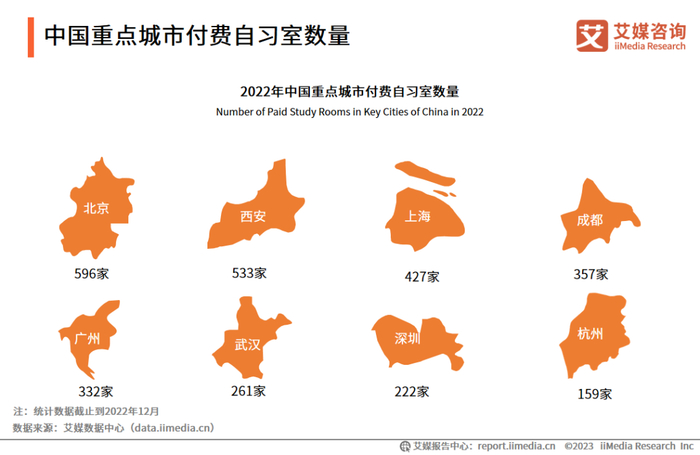 iiMedia Research(艾媒咨询)数据显示,2022年,中国北上广深等城市付费自习室较火热,付费自习室开设数量较多,行业竞争加剧。