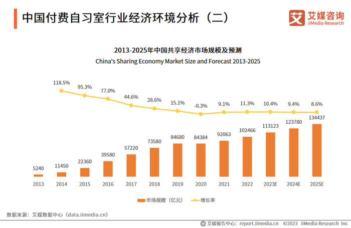 iiMedia Research(艾媒咨询)数据显示,2022年中国共享经济规模为102466亿元。艾媒咨询分析师认为,付费自习室作为共享经济业态的一种,随着疫情的放开,付费自习室在2023年将伴随共享经济的复苏而继续增长。