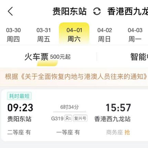 从贵阳东出发成人二等车厢为500元,一等车厢801元,商务车厢为1502元。
