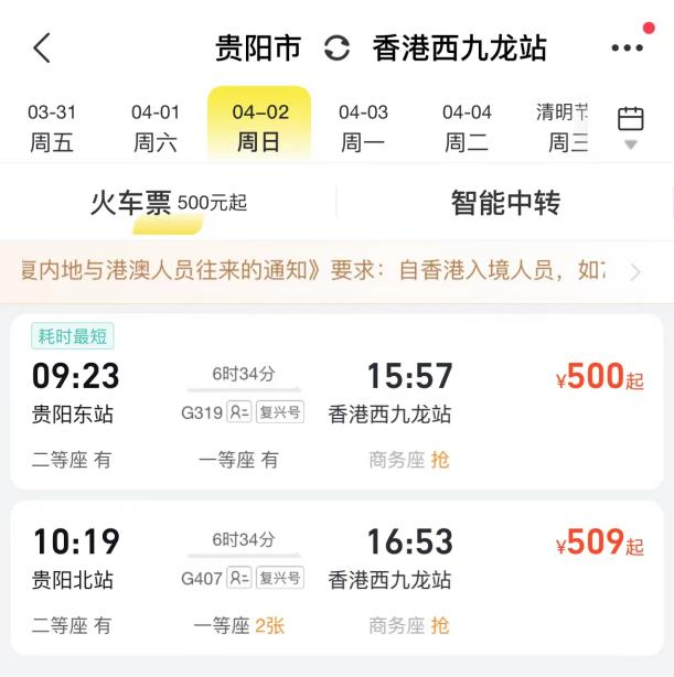 高铁去香港的价格是多少呢?据港铁发布的车费表显示,从贵阳北出发成人二等车厢为509元,一等车厢为816.5元,商务车厢为1531元。