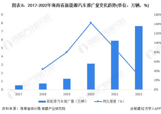 2017-2022年海南省新能源汽车产业保持高速增长态势,推广量从2017年的0.50万辆增长至2022年的7.64万辆,年均复合增速达72.5%。2022年海南省新能源汽车推广量为7.64万辆,较2021年同比增速约30%,下滑的原因主要系2021年新能源汽车推广量基数高以及2022年防疫政策升级影响汽车销售。