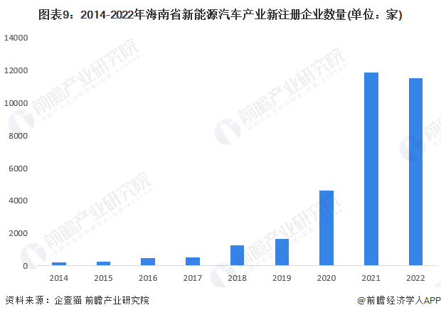 根据企查猫查询数据显示,2014-2022年海南省新能源汽车产业新注册企业数量快速增长。其中,2020-2021年新注册企业数量爆发式增长,新注册企业数量分别为4601、11866家,同比增速分别达79%、58%。2022年海南省新能源汽车产业新注册企业数量为11505家,较2021年略有下滑主要系2021年基数较高以及2022年防疫政策升级减弱经济活动。