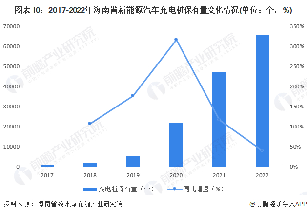 从新能源汽车配套充电桩来看,2017-2022年新能源汽车产业配套设施发展迅速。2022年海南省充电桩数量达6.6万个,较2017年的916个增长超71倍,年均复合增速达135%。目前,海南省已经实现了44个高速服务区充电桩全覆盖,全省各市县乡镇充电桩覆盖超过95%。