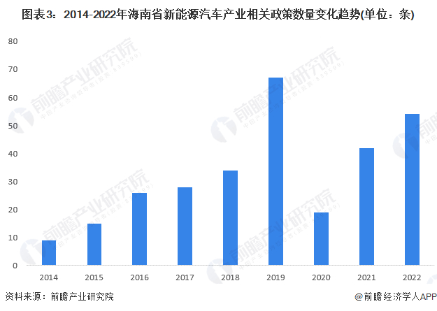 2014年以来海南省颁布实施了多项行动方案促进新能源汽车的发展,且呈现出支持力度逐渐加大的趋势,尤其2019年新能源汽车产业相关政策数量达67条,较2018年34条多了近一倍;但受到疫情的影响,海南省2020-2022年的新能源汽车产业政策数量较2019年有所降低,2022年的政策数量为54条,恢复至2019年的81%,预计未来会随着疫情影响减弱而继续回升。2023年,截至2月末,海南省共有9条相关政策公布。