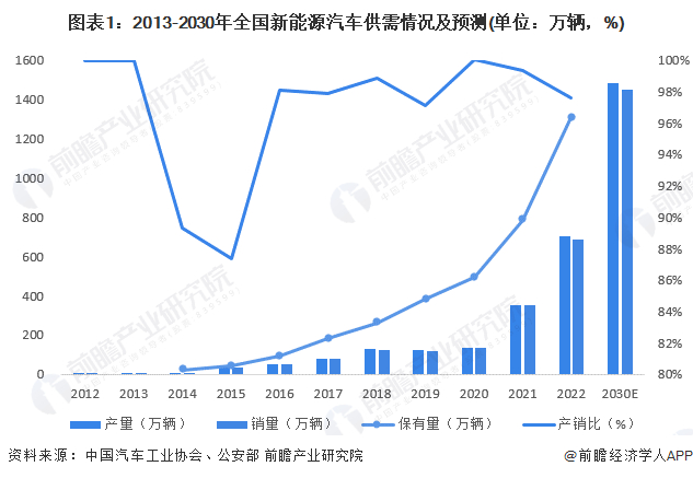 新能源汽车是我国实现双碳目标的重要战略举措。受益于政策支持和技术成熟,2013-2022年我国新能源汽车产销量保持高速增长,2022年,全国新能源汽车实现产量705.8万辆、实现销量688.7万辆;同时,据公安部数据显示,截至2022年末,全国新能源汽车保有量已达1310万辆,占汽车总量的3.14%。,根据中汽协数据,2022年中国新能源汽车渗透率约为25.6%,预计于2030年达50%,预计新能源汽车销量将突破1400万辆。