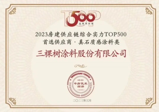 3月23日,《2023中国房地产开发企业综合实力TOP500测评研究报告》发布,三棵树凭借强劲的品牌实力、绿色创新产品及优质服务口碑,实力入选“2023房建供应链综合实力TOP500强首选供应商”榜单,荣膺“工程外墙类民族品牌”“多彩仿石类”“真石质感涂料类”“艺术涂料品牌”“真石漆类”“高端仿石漆(水性含多彩)”“涂料装饰保温一体板(双包)类”六项榜单。