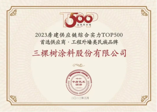 此次,据《2023中国房地产开发企业综合实力TOP500测评研究报告》显示,三棵树斩获“工程外墙类民族品牌”的荣誉,印证了三棵树的战略发展方向的正确性。