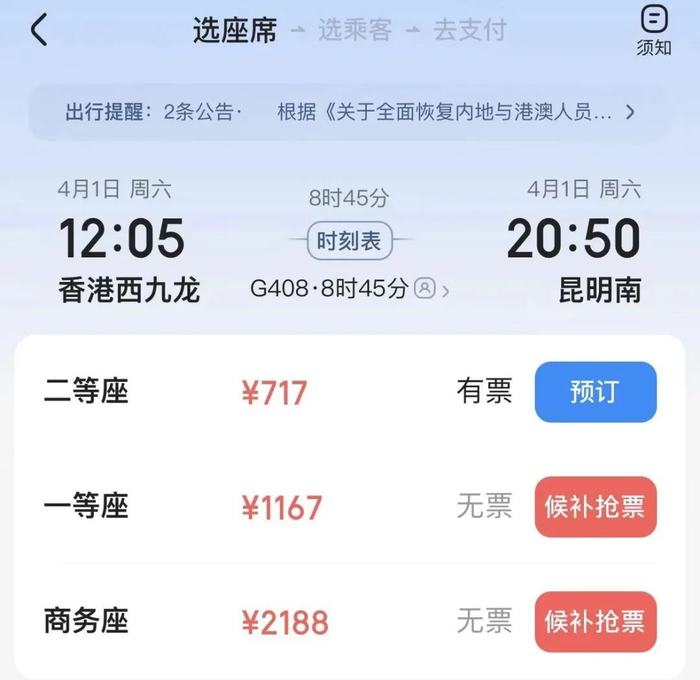 香港西九龙至昆明南方向的车票同样如此,4月1日的一等座和商务座已售空,仅二等座有票。4月2日至6日商务座也已售空。