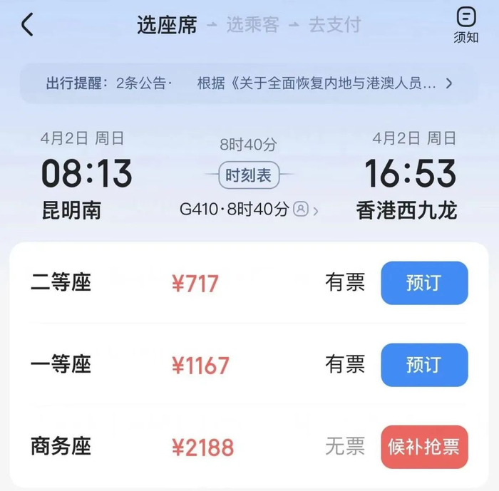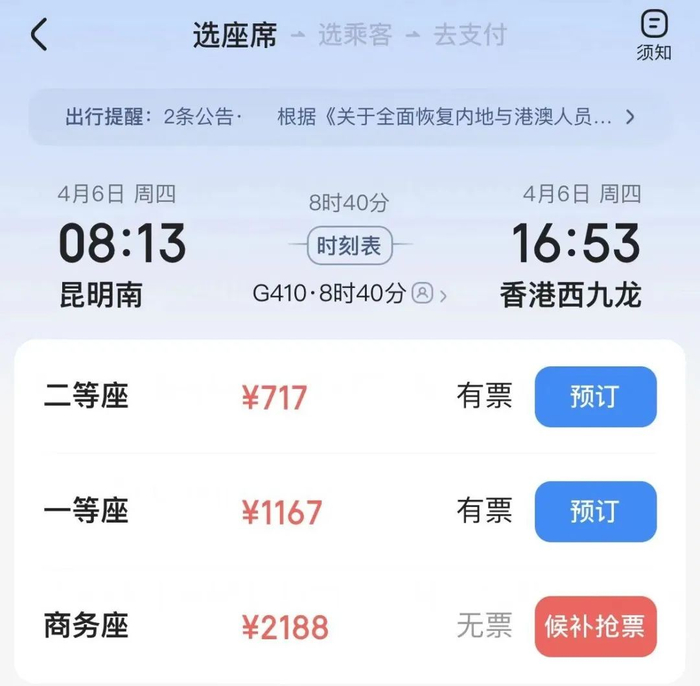 记者登录12306客户端,发现可以购买4月2日-5日昆明南前往香港西九龙的车票,但商务座已经销售一空,处于候补状态。一等座、二等座还显示有票。
