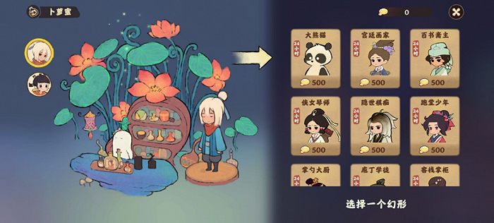 游戏目前的付费点主要在建筑及“幻形”上。前者一方面是游戏随着个人等级提升,用游戏内金币便可购买的萝卜小建筑,另一方面则需要通过“创物”功能抽取。在未氪金的情况下,我也能攒出3个十连抽,还未用完建筑卷轴,已经获得“溪曲归梦”的全套建筑。