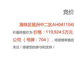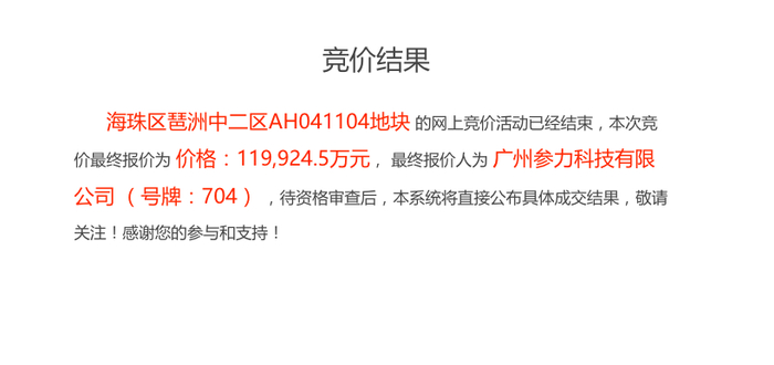 3月24日上午,广州首轮供地清单中的海珠区琶洲中二区AH041104地块竞价出让,由广州参力科技有限公司以119924.5万元底价竞得,楼面价13721元/㎡(未扣除配建)。