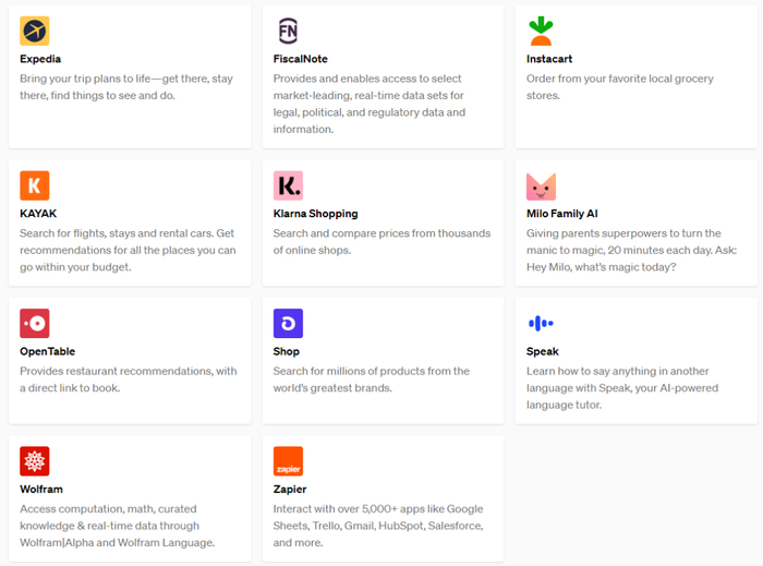 OpenAI称,已经从其候补名单中被筛选出来的插件开发者已使用OpenAI来为ChatGPT开发插件。这批插件由Expedia、FiscalNote、Instacart、KAYAK、Klarna、Milo、Open Table、Shopify、Slack、Speak、Wolfram和Zapier创建。从这些公司的业务可以看出,OpenAI放出的第一批插件就几乎已经涵盖了人们生活中的衣食住行、工作与学习的方方面面……