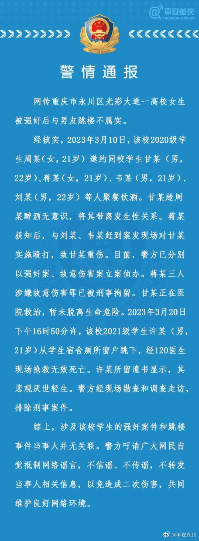 重庆一高校女生被强奸后与男友跳楼?警方通报:强奸案和跳楼事件无关联
