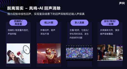 另一方面,回声是影响音视频通话质量的主要因素之一,尤其在线上会议、在线K歌、多人连麦等场景中,不仅损害通话质量,影响用户体验,还可能导致带宽增加。凤鸣·AI回声消除利用算法对环境中产生的回声混响进行有效抑制,智能适应各类环境,实现精准音源分离,从混合的近端信号中消除不必要的远端信号,保留近端人声发送到远端,全面消除回声,实现高保真音频体验。比如,在双人合唱等在线音乐场景下,AI回声消除可以使得人声自然流畅,增益效果显著。