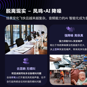 AI降噪是凤鸣AI引擎的重要能力之一。想要在“脱离现实”的环境中办公、娱乐,屏蔽外界干扰是基础。相比于传统的降噪算法,凤鸣·AI降噪的效果有显著提升,可以一次性解决100+种突发性噪声,比如办公场景经常遇到的敲键盘、鼠标点击、电话铃声;家庭环境中遇到的小孩哭叫、装修、厨房做饭声;户外环境中的风声、雨声、汽车噪声等。