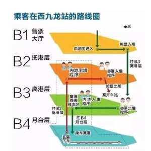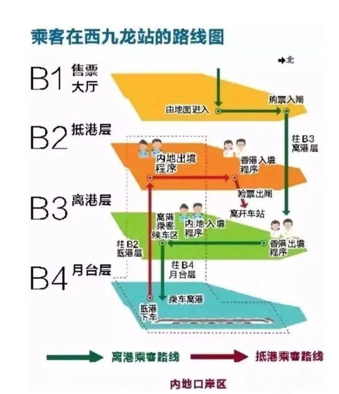 具体操作步骤:在B4台层下车→前往B2入境层办理内地出境程序,然后离开内地口岸区→进入同一层B2的香港口岸区,办理香港入境程序→离开西九龙站,入香港。