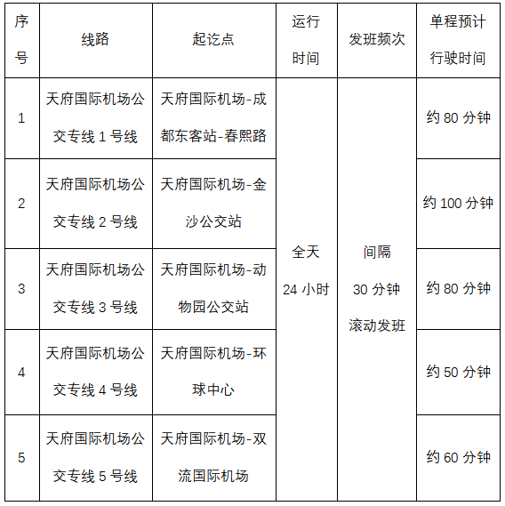 公交专线方面,经优化调整,共开行天府国际机场公交专线5条,分别由天府国际机场到达成都东客站、春熙路、金沙公交枢纽站、动物园公交站、环球中心、双流国际机场,覆盖市中心区域各个方向,所有线路均为全天24小时运营,间隔30分钟滚动发班,定线定班。如遇满座则即刻发班,高速直达市区,单程时间预计在50—100分钟之间。