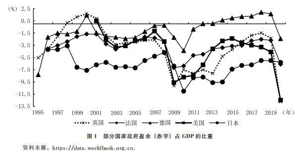 为了解释实践,西方学者不仅提出了挤出效应、卡尔多效应、税收楔子等概念和理论,也在财政赤字、政府债务等方面提出了安全性标准。例如,罗伯特·海尔布朗讷、彼得·伯恩斯坦提出:“在正常年景中,我们赞成有‘赤字’,(赤字)占国民生产总值的2%到3%”。又如,一度在社会上影响较大的欧盟“赤字3%和政府债务率60%”的警戒线。然而,在现实中,很少有国家遵从这些标准。例如,在2008年全球金融危机和2020年新冠肺炎疫情之后,发达国家的财政赤字率都大幅提升,远超3%警戒线(如图1所示)。这些状况表明,现有宏观财政理论分析似乎并没有把握问题的实质。近年来,西方学者研究各国应对新冠肺炎疫情的财政政策时,也对现有的一些判断标准提出异议。例如,V. Constâncio财政政策发挥了更加积极的作用,现有的共识发生了一些变化,出现了新的观点,提出了修订欧盟财政框架的必要性。