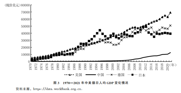 尽管我国的经济实力发生了历史性巨变,但在人均GDP、人均资本存量等方面与发达国家仍有较大差距(如图3所示)。例如,2021年,我国人均GDP大致相当于美国、德国和日本的17.9%、24.3%和31.4%;人均资本存量按可比价格衡量也大致只是日德20世纪七八十年代的水平,体现经济技术水平和产出效率的全要素生产率也与之差距甚大。从现实来看,我国具备保持经济中高速增长的诸多条件和潜力,积极财政政策的主要任务就是稳定经济增长、激发市场活力和经济发展动力,提升未来潜在增长水平,确保经济持续中高速增长,推动高质量发展,助力我国第二个百年奋斗目标的实现。