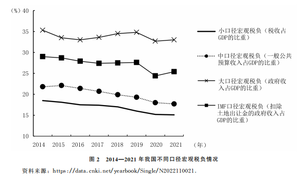 第二次实施积极财政政策则是2008年。当时出现了结构性因素与周期性因素双重叠加的状况,我国经济发展面临很大压力。美国的次贷危机于2008年9月初引起国际金融危机,对全球金融市场产生了严重的冲击,世界主要发达国家的经济陷入衰退。我国的经济也面临着严峻的形势。为此,我国于2008年下半年开始实施积极财政政策,其主要措施包括实施大规模减税降费、扩大赤字和政府债务、加大政府投资、调节财政支出结构等。与第一次相比,第二次积极财政政策呈现出工具和方式更加丰富多样、力度更大、针对性更强等特点。例如,第一次积极财政政策没有将减税作为刺激内需的手段,其主要原因在于当时的税收环境和市场环境不适应,市场机制不健全,存在各种偷骗税、越权减免税等现象;而在第二次的积极财政政策中,减税降费成了重要手段,我国进行了史无前例的大减税,宏观税负不断降低(如图2所示)。根据宏观形势和政策任务、目标和工具的变化,我们将2008年以来的积极财政政策划分为两大阶段: