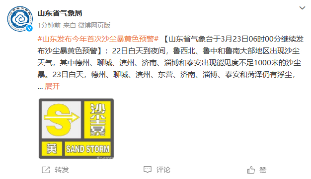3月21日,内蒙古二连浩特出现沙尘暴天气,下午5点左右,天空变为橙色。当地发布橙色预警,强沙尘暴天气来袭,能见度将小于500米。@山东省气象局消息,3月23日6时继续发布沙尘暴黄色预警。
