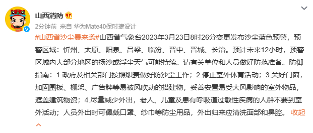 @山西消防消息,山西省气象台2023年3月23日8时26分变更发布沙尘蓝色预警。
