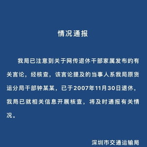 3月24日,深圳市交通运输局发布情况通报称,该局已注意到关于网传退休干部家属发布的有关言论,经核查,该言论提及的当事人系该局原货运分局干部钟某某,已于2007年11月30日退休。该局已就相关信息开展核查,将及时通报有关情况。