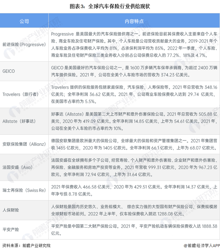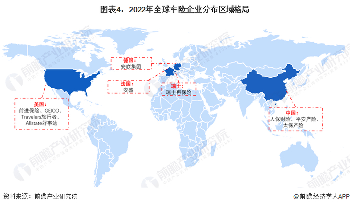 从汽车保险企业分布来看,中国汽车保险企业主要有“老三家”人保财险、平安产险和太保产险;美国汽车保险企业也较多,主要有前进保险、GETCO、旅行者、好事达等;德国车险企业有安联保险集团,法国车险企业有安盛集团,瑞士则有瑞士再保险公司。