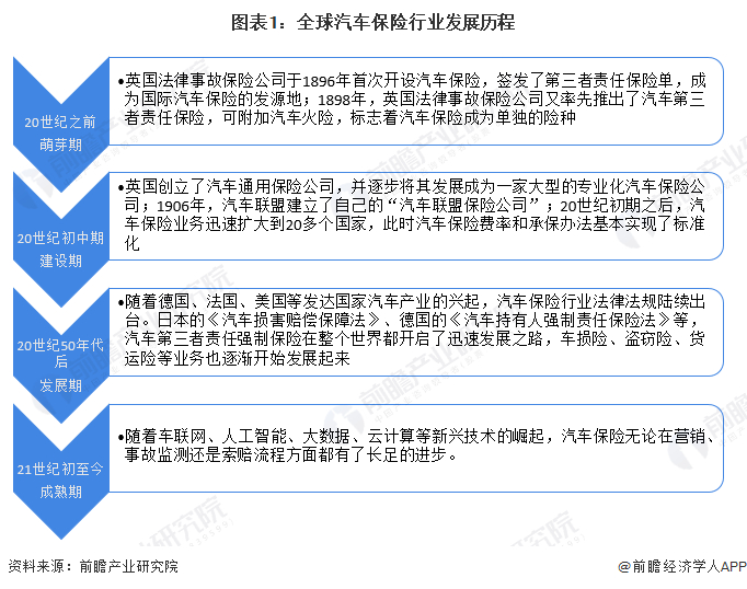 国外汽车保险起源于19世纪中后期,随着欧、美、日等地区和国家汽车制造业的迅速扩张,机动车辆保险也得到了广泛的发展。现代汽车保险起源于英国,汽车保险经历了20世纪之前的萌芽期,20世纪初中期的建设期,20世纪50年代后的发展期,以及21世纪以来的成熟期并朝智能化方向发展四个阶段,具体发展历程如下。