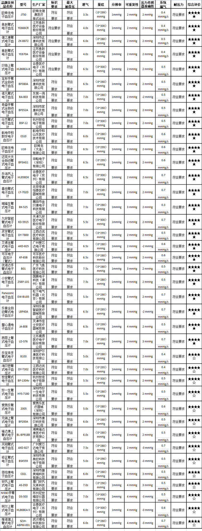 计量性能测试涉及的压力传感器准确性、可重复性两项指标,直接关系到血压测量结果,其数值的绝对值越小越好。其中18款样品表现较好,分别为:欧姆龙电子血压计J750、鱼跃臂式电子血压计YE666CR、健之康臂式电子血压计ZK-B872、鱼跃臂式电子血压计YE670A、贝稳上臂式电子血压计HL868EA-8、宝彤手臂式全自动电子血压计 BP380A、诺凡臂式电子血压计BA-803、奇盛手臂式全自动电子血压计BP352A、仕杰臂式电子血压计BSP-12、航电中和数字电子血压计ES10、欧姆龙电子血压计U16、迈克大夫全自动臂式电子血压计BP3AG1、乐活氏上臂式电子血压计HL858DK、喜尚臂式电子血压计LY-702D、九安智能臂式电子血压计KD-5915、灵宇臂式电子血压计DY-T800、艾德龙臂式电子血压计AXD-825、可孚电子血压计(臂式)KF-65B。