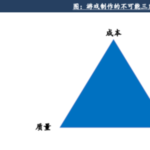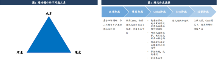 游戏制作的不可能三角:“成本、质量、速度”只能有其中两个。游戏作为集美术、动画、音乐、文字等多模态内容为一体的娱乐内容,制作内容及流程非常复杂,同时从产品立项、原型落地、Alpha测试、Beta测试,再到正式上线,涉及到多个部门团队的协调,因此一直存在着“不可能三角”,即在给定产品质量水准的前提下,无法实现快速、低成本的制作。