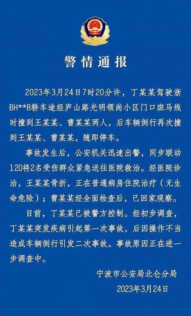据宁波市公安局北仑分局发布警情通报,2023年3月24日7时20分许,丁某某驾驶浙BH**B轿车途经庐山路光明领尚小区门口斑马线时撞到王某某、曹某某两人,后车辆倒行再次撞到王某某、曹某某,随即停车。事故发生后,公安机关迅速出警,同步联动120将2名受伤群众紧急送往医院救治。经医院诊治,王某某骨折,正在普通病房住院治疗(无生命危险);曹某某经全面检查后,已回家观察。目前,丁某某已被警方控制。经初步调查丁某某突发疾病引起第一次事故,后因操作不当造成车辆倒行引发二次事故。事故原因正在进一步调查中。