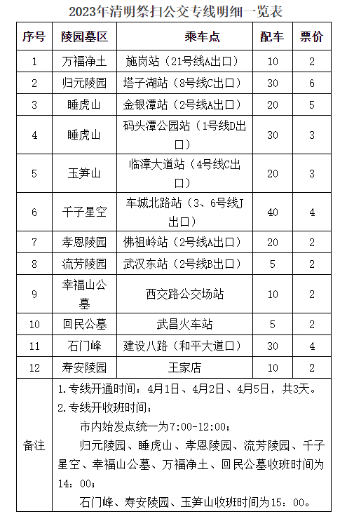 根据方案,4月1日起,市公交集团将开通12条祭扫公交专线,并在市内设12个乘车点,直达万福净土、睡虎山、归元陵园、玉笋山、孝恩陵园、流芳陵园、石门峰、寿安陵园、千子星空、幸福山公墓、回民公墓等陵园墓区。