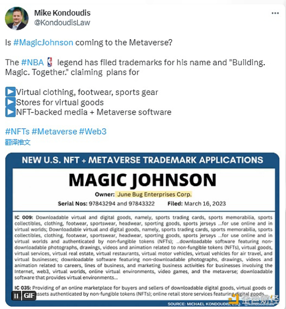 根据商标代理律师Mike Kondoudis在社交媒体披露的两份美国专利商标局文件97843294和97843322显示,NBA球星“魔术师”约翰逊已经为“Magic Johnson’s Neighborhood”和“Building.Magic.Together”提交了商标申请,申请内容包括可下载的虚拟和数字商品,即体育交易卡、体育纪念品、体育收藏品、服装、鞋类等,以及个人电子设备和充电器,在每种情况下,都用于在线和虛拟世界中,并通过NFT进行验证,为可下载数字商品、虛拟商品或NFT认证的数字化资产的买卖双方提供在线市场,以数字商品、虛拟商品或数字化资产为特色的在线零售店服务,为用户提供在线社区论坛、在线环境、虛拟在线环境和扩展现实虚拟环境,以进行虚拟体验和使用虛拟商品和项目。