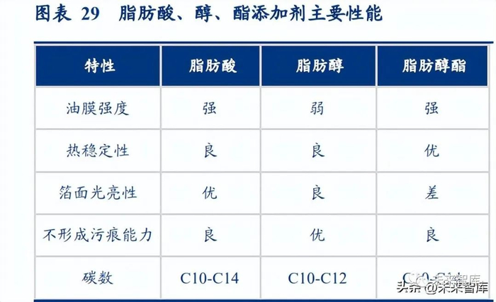2)轧制油及添加剂:铝压延成型过程中金属基体连续变形,不断产生新的金属表面,新 表面具有很高的化学活性,极易与轧辊黏着,需要轧制油在加工界面上铺展形成润滑油 膜。轧制油一般由 90%~99%基础油与 1%~10%添加剂混合而成,在高温高压工作环境中 添加剂可以在轧辊和轧件表面形成物理吸附膜,有效减少直接接触面积,降低轧制压力, 减小表面划痕。最常见添加剂种类有脂肪酸、脂肪醇、脂肪醇酯,一些厂商也会在轧制 油中添加极压剂等新材料优化润滑性能,铝箔厂商需要针对不同类型铝箔的产品和客户 要求,选择合适的添加剂及其配比。