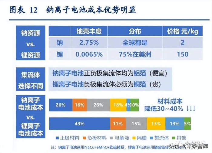 相较磷酸铁锂电池,钠离子电池兼具低成本、快充性能、高低温性能、安全性优势。成 本方面,钠资源价格显著低于锂,据中科海钠介绍,钠资源地壳含量丰富,占 2.75%, 锂资源仅占 0.0065%。价格上锂资源价格是钠的 75 倍。电池成本上,钠离子电池相比锂 离子电池,材料成本降低 30%-40%。快充性能方面,钠离子电解液具有比锂盐电解液更 高的离子电导率,快充性能好。低温性能方面,钠离子电池可以在-40℃到 80℃的温度 区间正常工作,-20℃的环境下容量保持率接近 90%,高低温性能优于其他二次电池。安 全性方面,钠离子电池的内阻比锂离子电池高,在短路的情况下瞬时发热量少,温升较 低,热失控温度高于锂电池,具备更高的安全性。