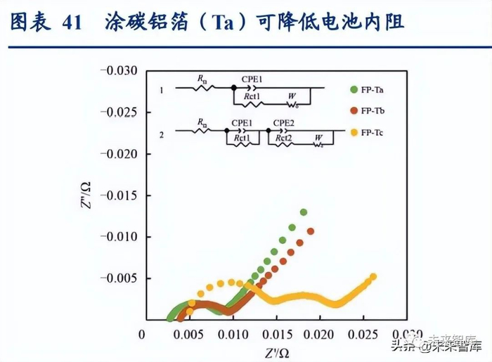 涂碳工艺可降低内阻、提高电池性能。涂碳铝箔是指在光箔上进一步涂覆粘结剂浆料, 浆料一般由炭黑、石墨以及树脂按比例调配而成。铝箔涂碳能显著降低磷酸铁锂电池的 内阻,改善活性物质与箔材的接触以及电流在极片内部的传导,从而提升电池的倍率、 低温、循环和储存性能。相较于三元电池,磷酸铁锂电池导电性差,能量密度低,涂碳 可提高磷酸铁锂电池的循环性能,因此磷酸铁锂电池的铝箔一般必须涂碳。