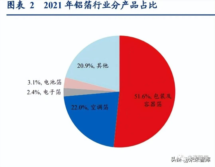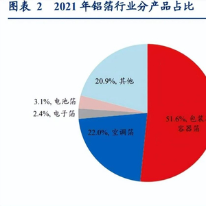 包装及容器箔占主要市场,电池箔规模小但增速领先。铝箔按下游应用领域可分为包装 箔及容器箔、空调箔、电子箔、电池箔等,其中包装及容器箔、空调箔占据铝箔主要市 场,2021 合计占铝箔总产量 73.6%,电池箔仅占 3.08%。在新能源需求拉动下,电池箔 增速远超行业增速,2019-2021年复合增长率达52.75%,铝箔行业2021年增速仅为9.64%。