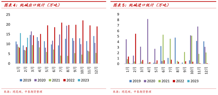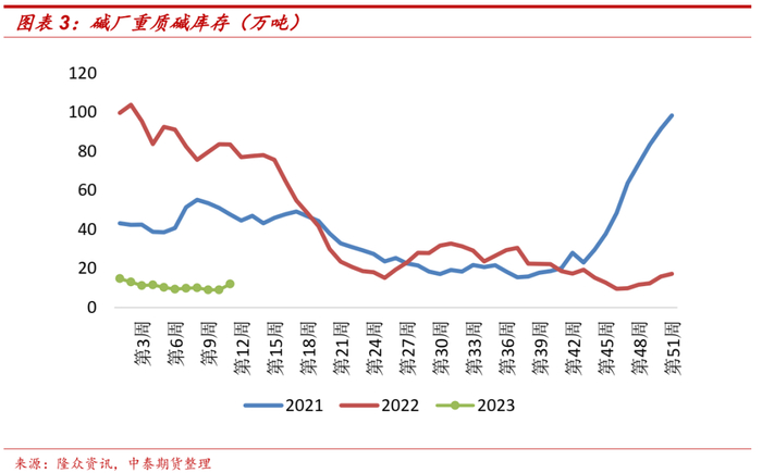 从2022年重质碱的供需复盘结果来看,可能有40万吨左右的隐性库存存在。目前重质碱的周度产量与需求处于紧平衡状态,对于后市来看,纯碱产能利用率已达最大化,开工率几乎没有继续提升的空间,光伏玻璃投产对纯碱的需求量还在增加,随着房地产复苏,浮法玻璃后续复产产线或将多于冷修产线,但短期内对重质碱的需求增量有限。在远兴能源能如期投产的前提下,下游不会进行多余的备货,按现有库存量来看,未来重质碱出现极度缺货的概率不大。